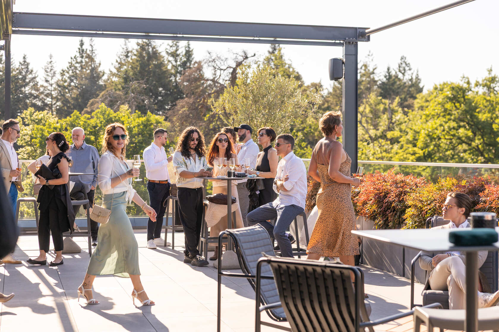 Genießt den atemberaubenden Ausblick von der exklusiven Plicana-Dachterrasse bei gutem Wetter. Der perfekte Spot für Drinks, Musik und unvergessliche Momente!